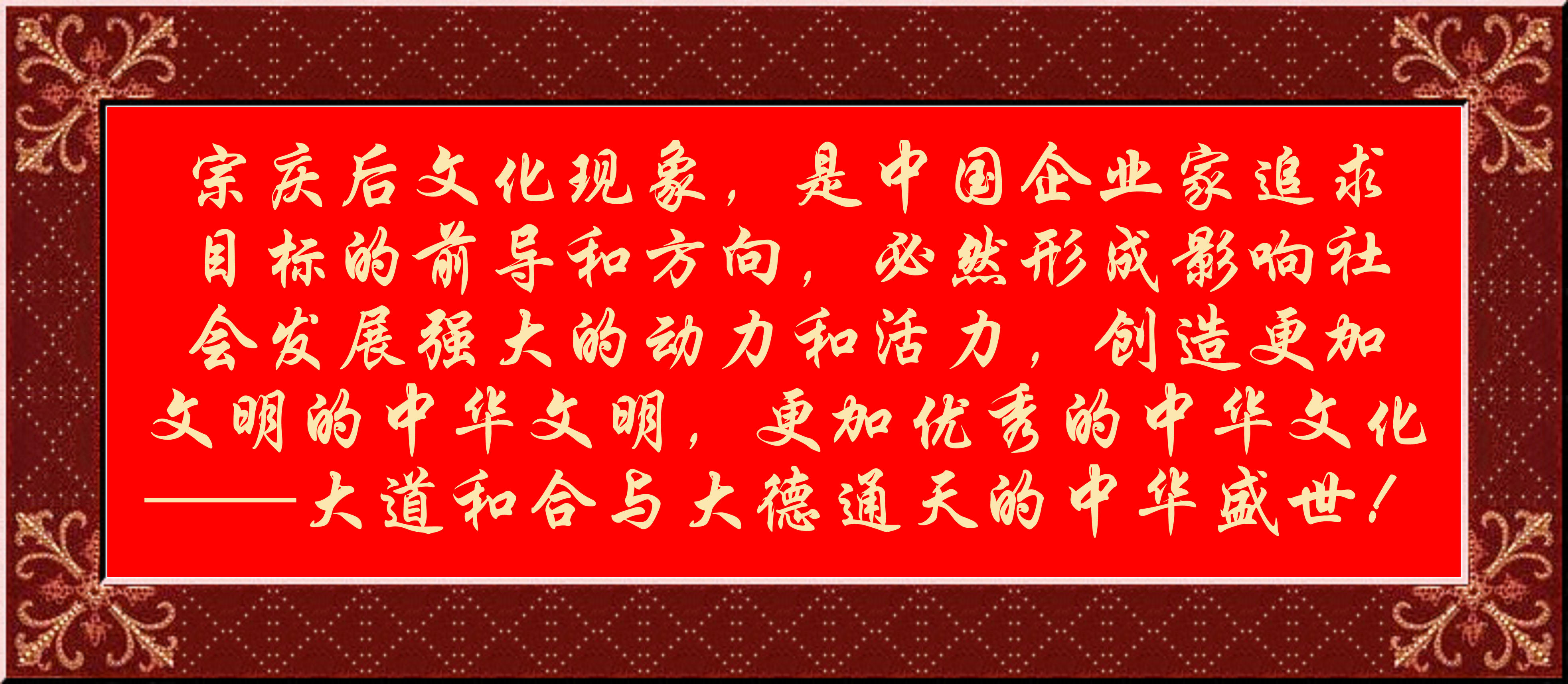 宗慶后文化現象,是中國企業家追求目標的前導和方向,必然形成影響社會發展強大的動力和活力,創造更加文明的中華文明,更加優秀的中華文化——大道和合與大德通天的中華盛世!