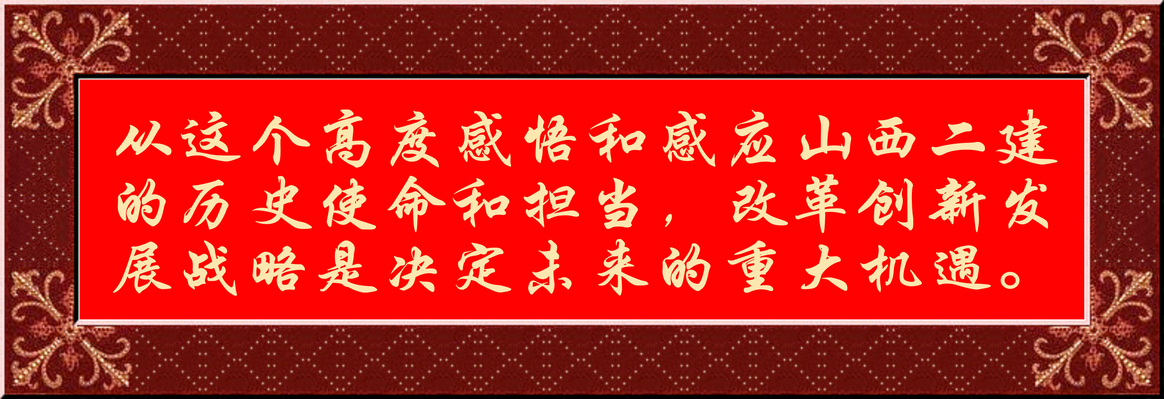 從三個新奇跡的高度感悟和感應山西二建當前和未來的歷史使命和擔當,改革創新發展戰略是決定未來成就的必由之路和重大機遇。今后二十五年是關鍵!是對每一位接棒新掌門人提出的歷史問卷,如何破題?如何超越?如何創造新的奇跡?!