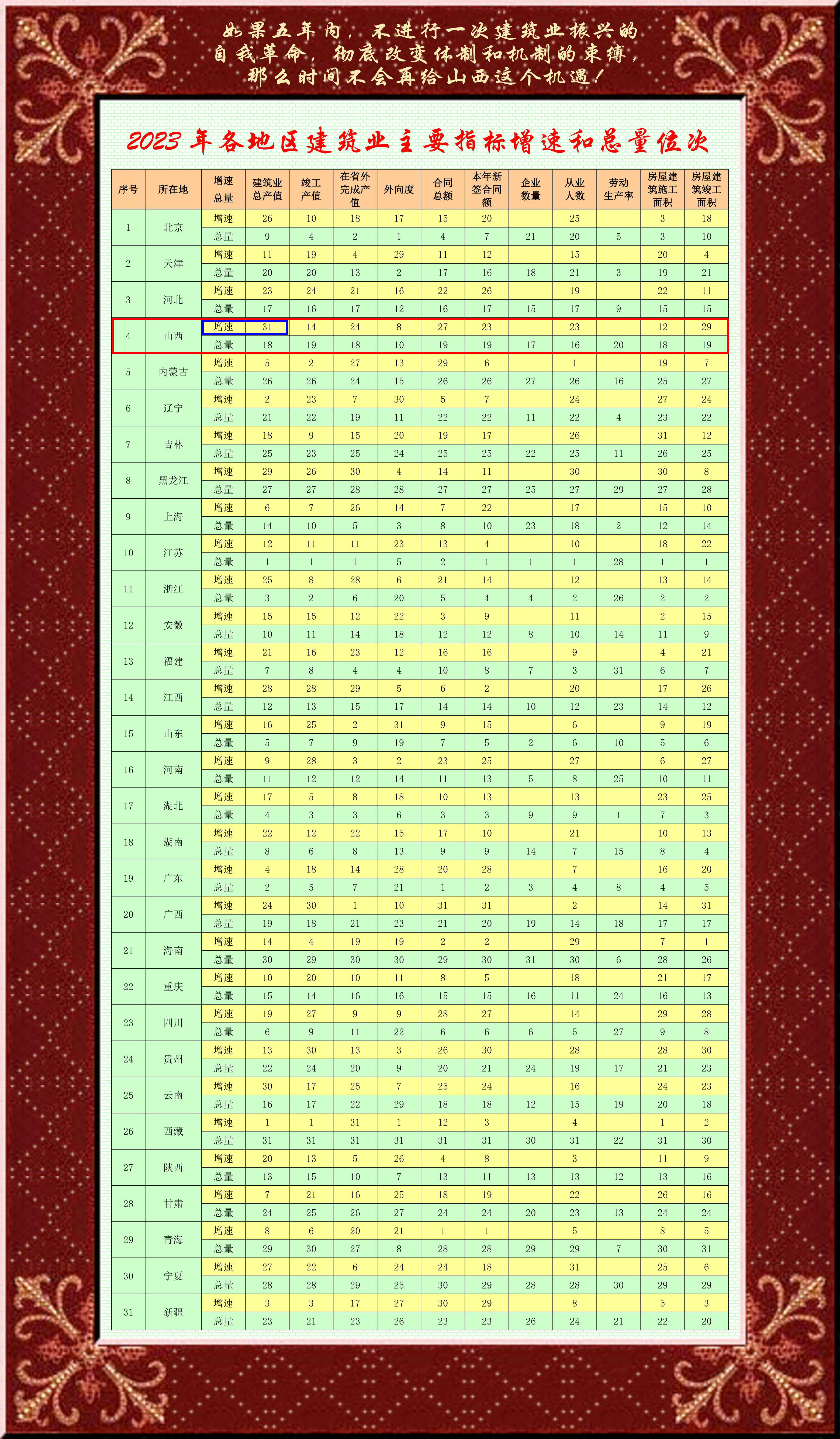 昨天,中國建筑業協會發布《2023年建筑業發展統計分析》,山西省建筑業主要指標增速全國墊底,總量排全國第18位,居全國中下水平。這個結果是意料之中的結果,更深層次又反映出什么問題呢?三個字:不重視!