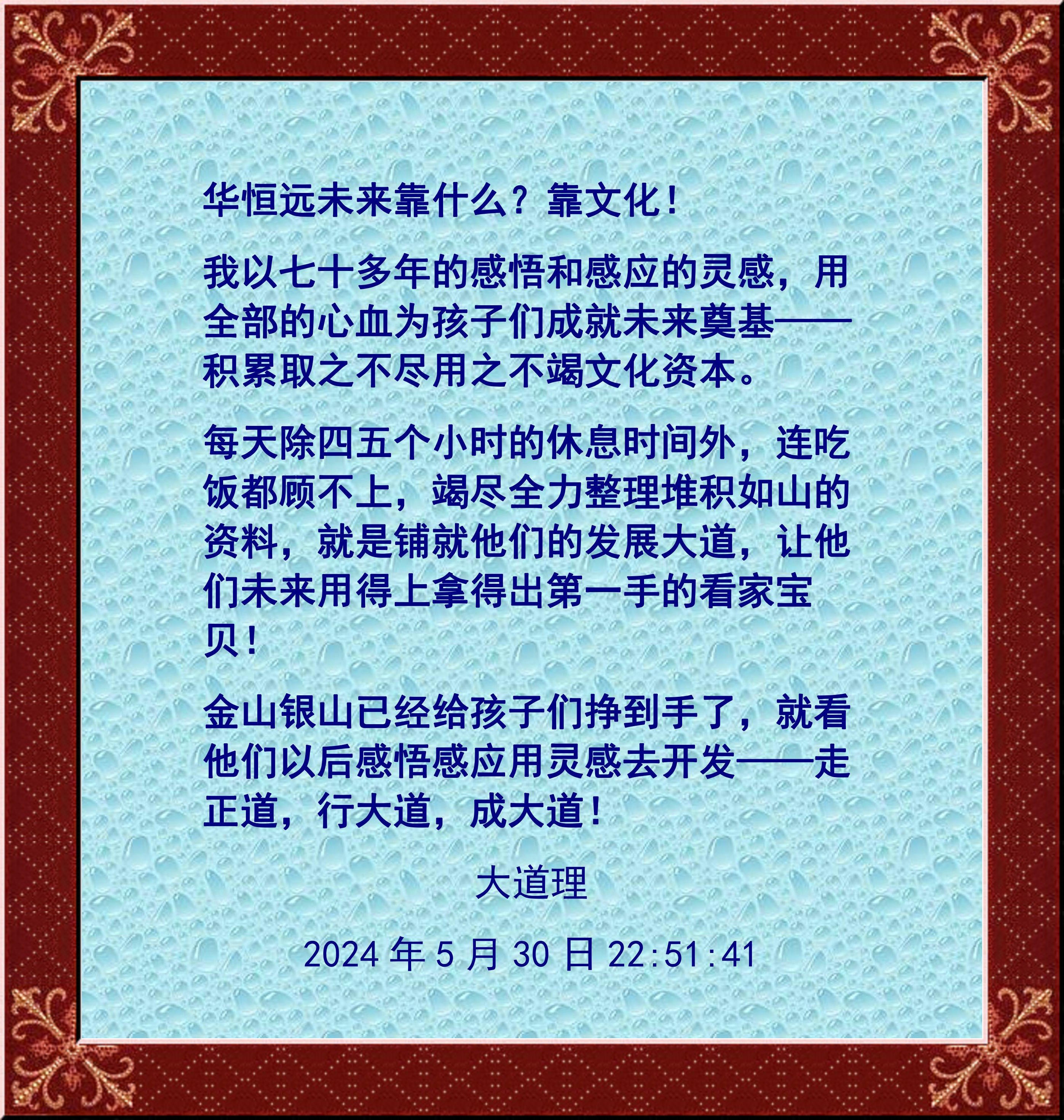 我以七十多年的感悟和感應的靈感,用全部的心血為孩子們成就未來奠基——積累取之不盡用之不竭文化資本。