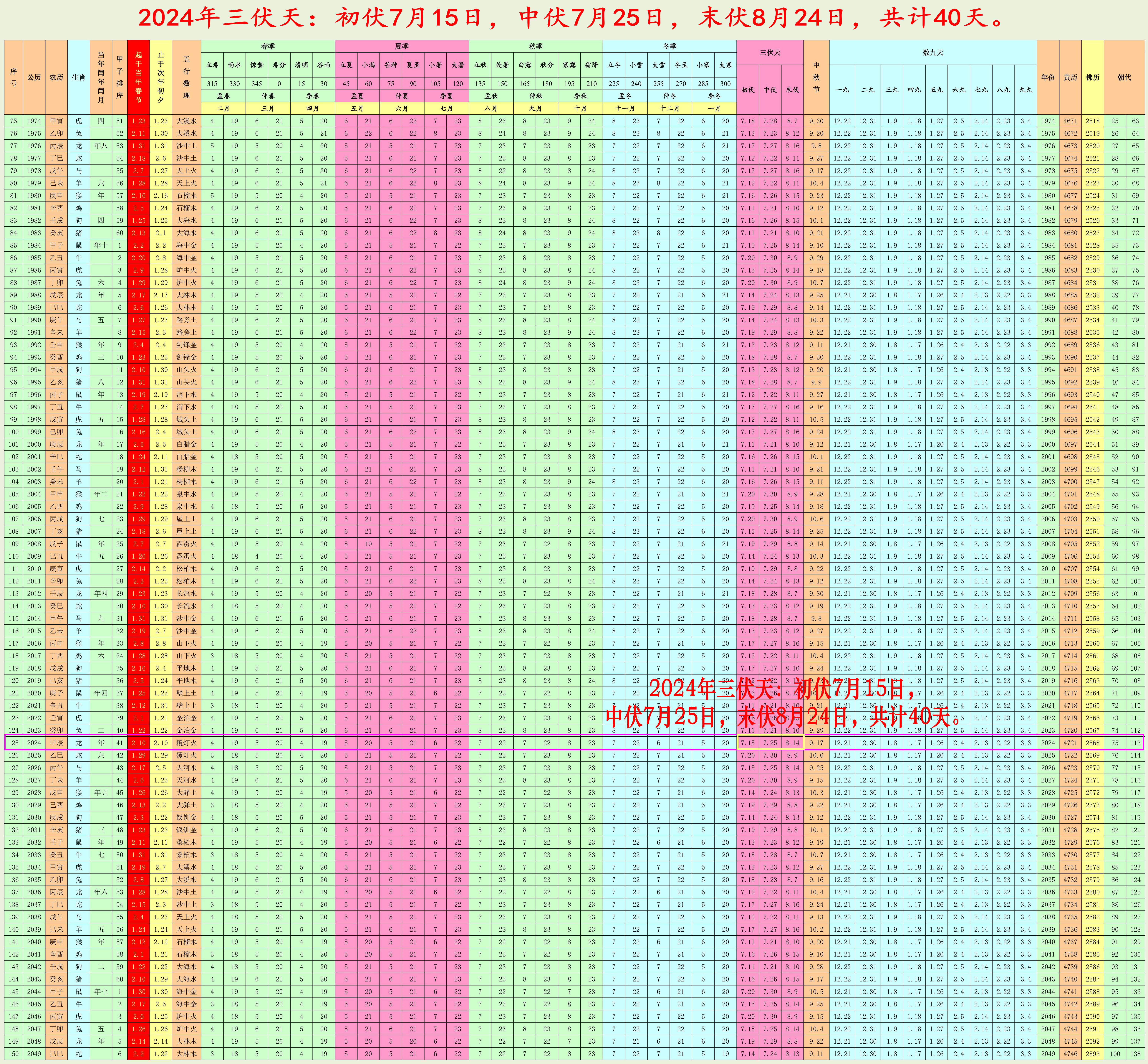 三、中伏起始日為28-30日,為10天;21-27日為20天。40年為一個(gè)轉(zhuǎn)換周期,其中10天年份11次,20天年份29次。初伏、末伏均為10天。