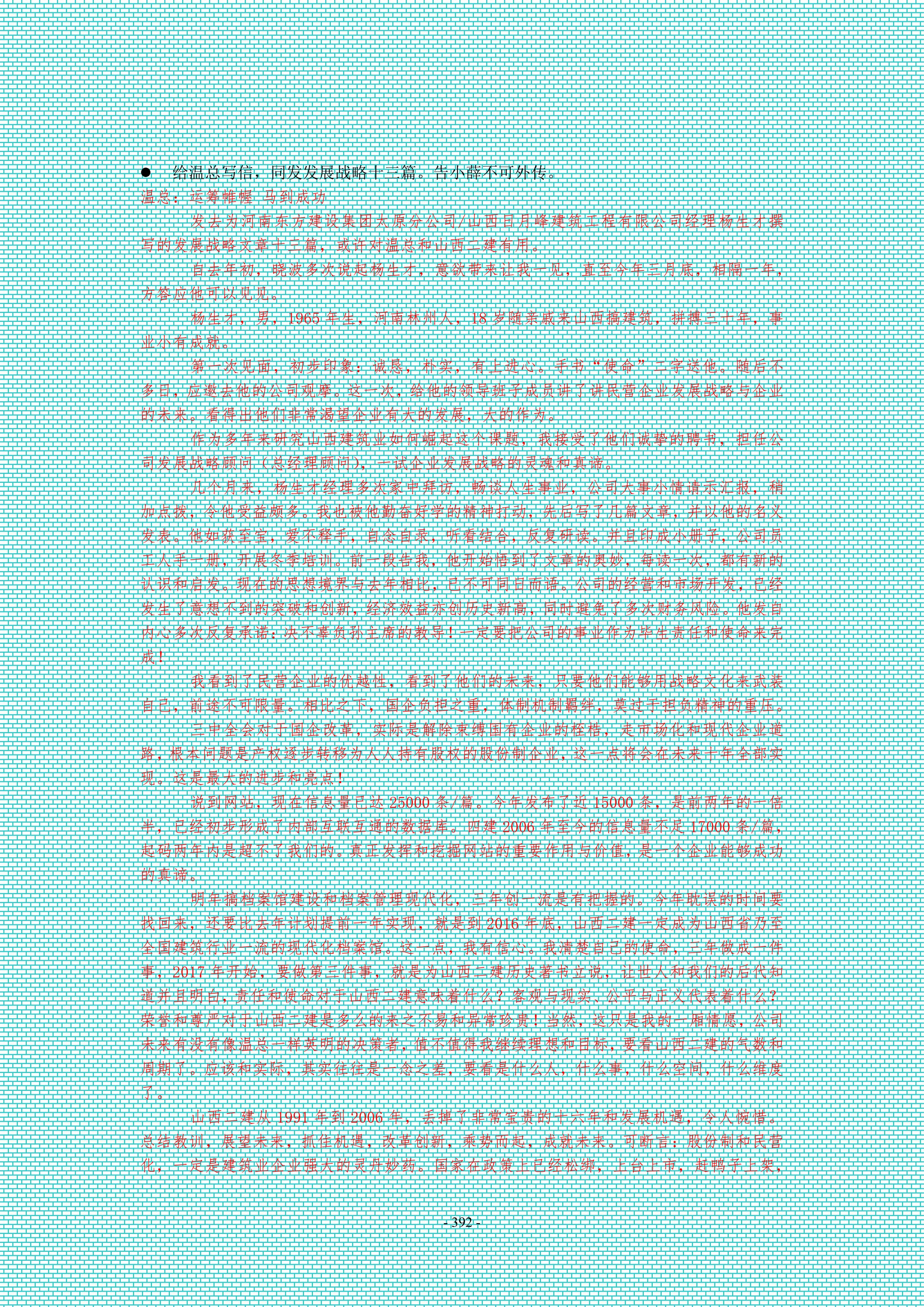 發(fā)去為河南東方建設(shè)集團(tuán)太原分公司/山西日月峰建筑工程有限公司經(jīng)理楊生才撰寫的發(fā)展戰(zhàn)略文章十三篇,或許對溫總和山西二建有用。