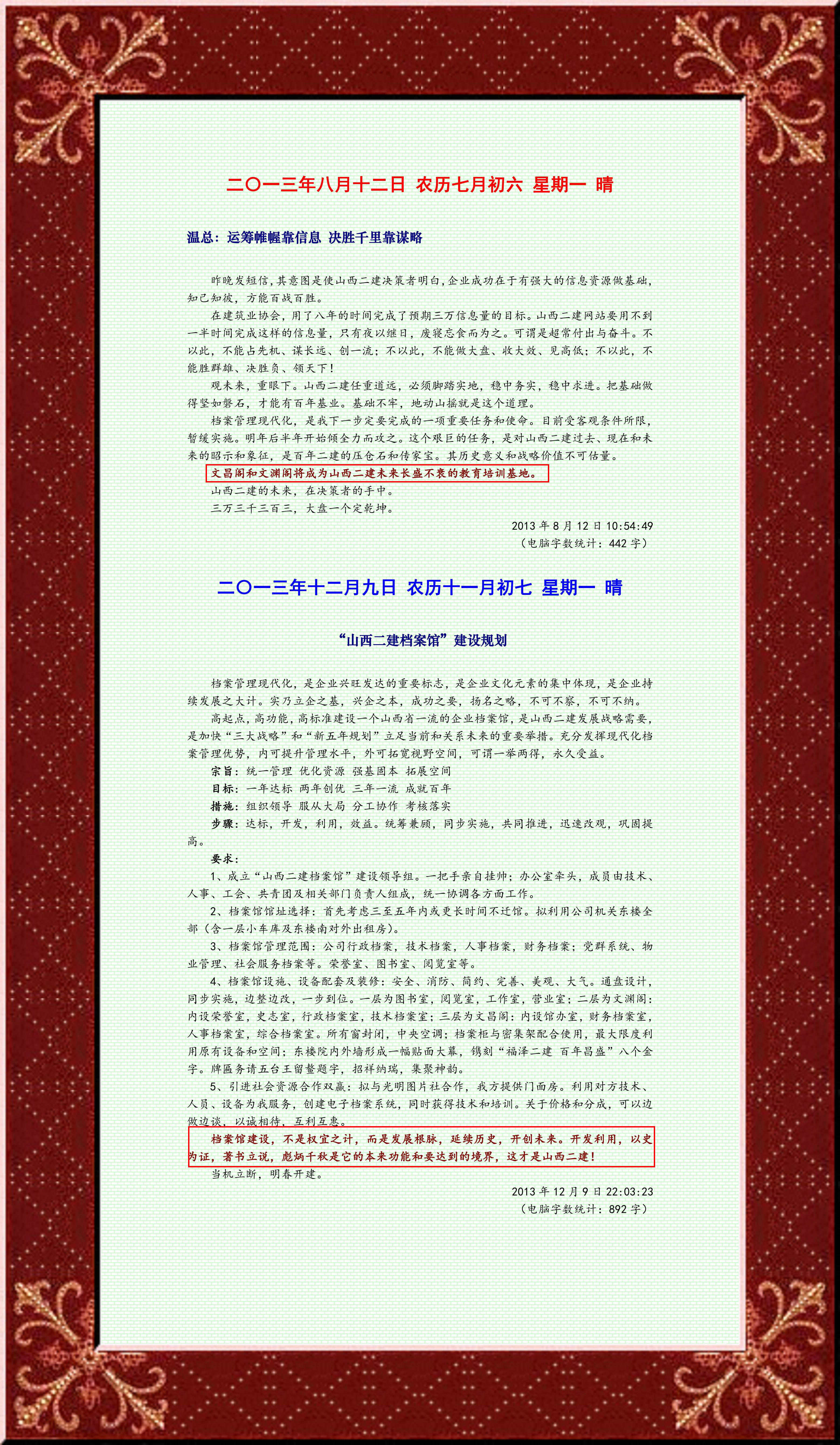 十年前,正是山西二建發(fā)生根本變革的時候,出于對企業(yè)未來的深入思考,我給掌門人提出文化建設(shè)大戰(zhàn)略建議。一是網(wǎng)站建設(shè)是企業(yè)文化向高端發(fā)展的平臺和載體;二是建設(shè)能夠容納更大歷史發(fā)展空間的檔案館,以文淵文昌兩閣命名,取天地之精華,修二建之祥瑞,納人間之正氣,成百年之基業(yè)!