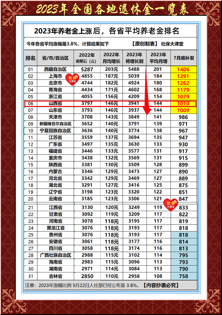 全國各地退休工資一覽表——2022年31個省份平均退休金排名更新