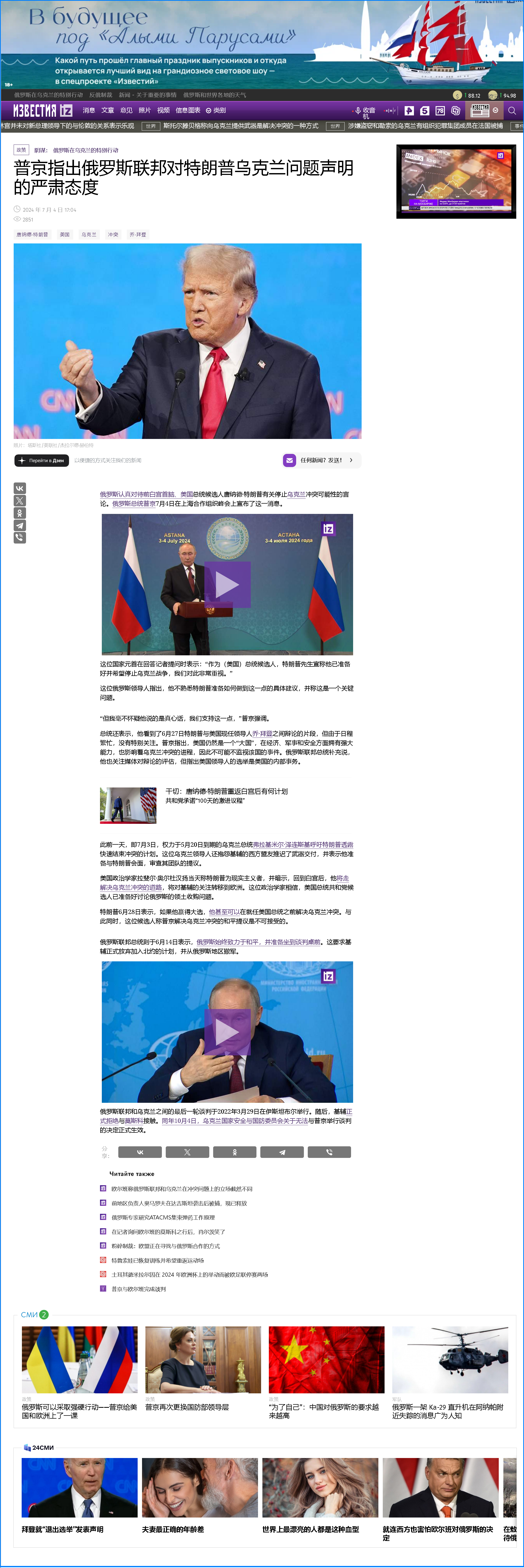 特朗普多次稱若當(dāng)選就在一天內(nèi)結(jié)束俄烏沖突,普京:俄方認(rèn)真對(duì)待他的言論