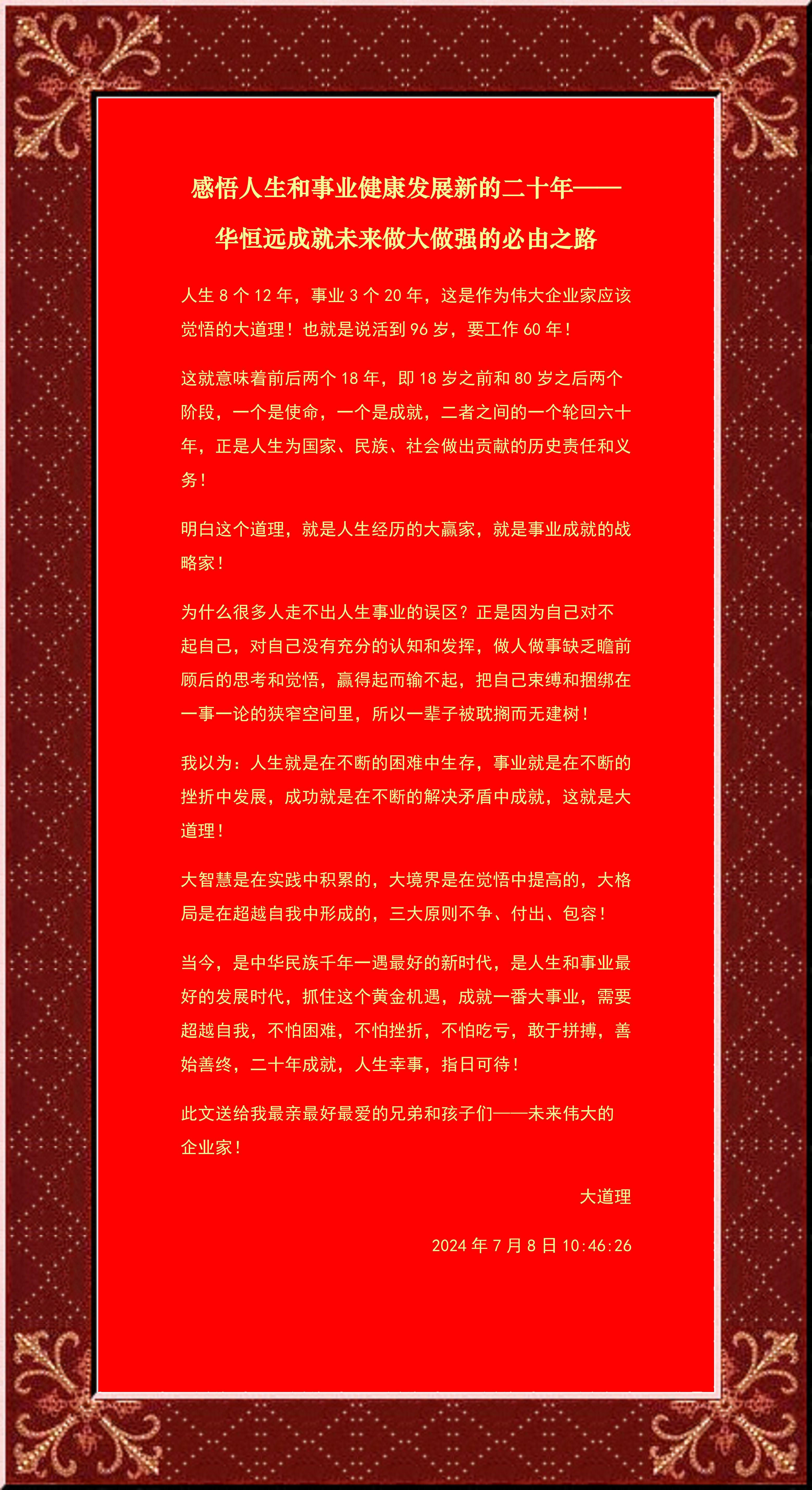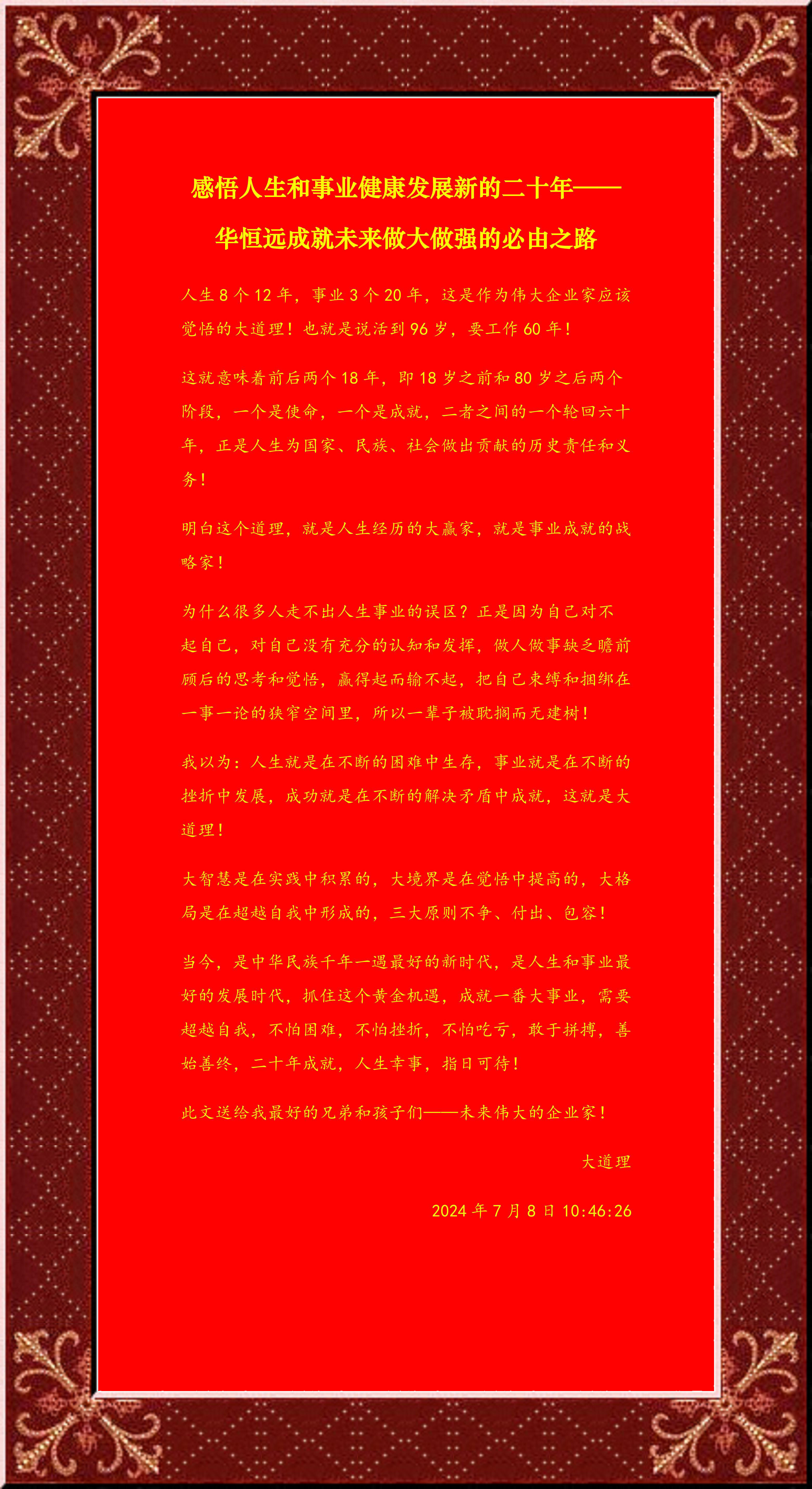 人生8個(gè)12年,事業(yè)3個(gè)20年,這是作為偉大企業(yè)家應(yīng)該覺(jué)悟的大道理!也就是說(shuō)活到96歲,要工作60年!